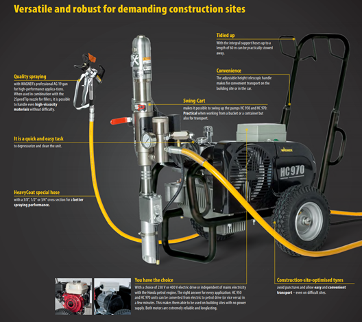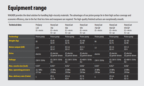 | Leveringsomvang | Zeer krachtige, hydraulisch aangedreven plunjerpomp (230 Volt) voor materialen met hoge viscositeit zoals o.a. brandvertragende coatings en airless dunpleister (E-SSP uitvoering). Directe aanzuiging zonder aanzuigslang. Met SSP schepplunjersysteem zeer hoog aanzuigvermogen. Verkrijgbaar met elektro-(E-versie) of benzinemotor (G-versie). Voor grote hoeveelheden materiaal te combineren met 100 liter container, zie accessoires. |